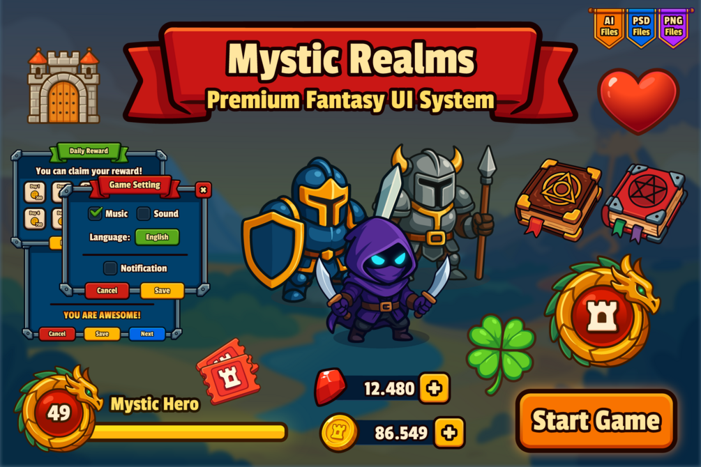Mystic Realms is a complete premium fantasy UI system crafted for mobile and desktop RPG, adventure, and hero-based games in a cute cartoon style.